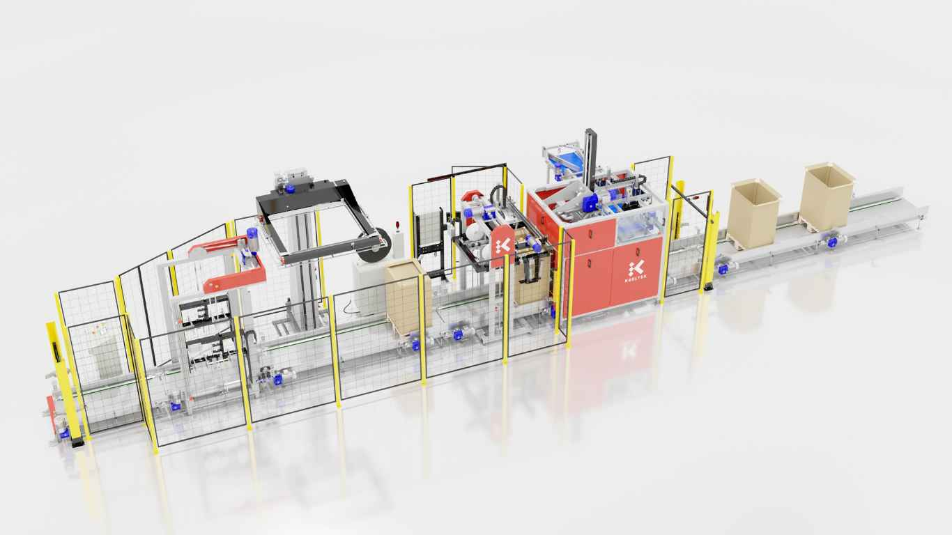 Línea de sobreembalaje, precintado, flejado y apilado de box