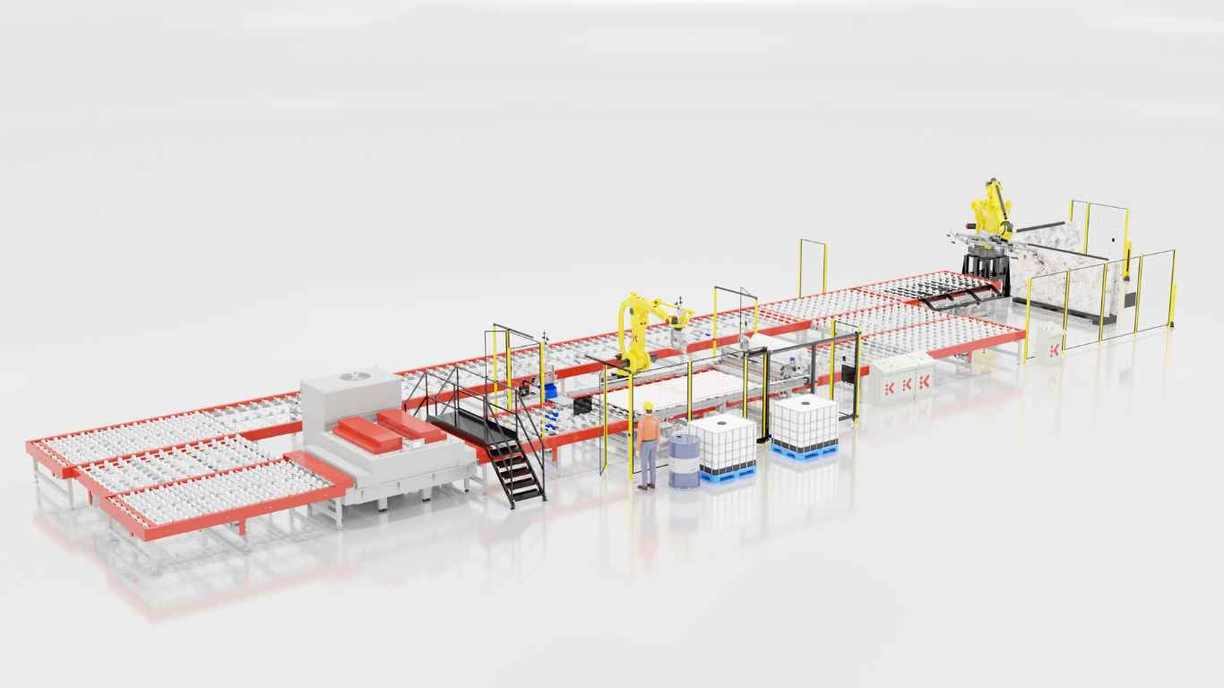 Línea para fijación de tejido de refuerzo sobre piezas cerámicas de gran tamaño